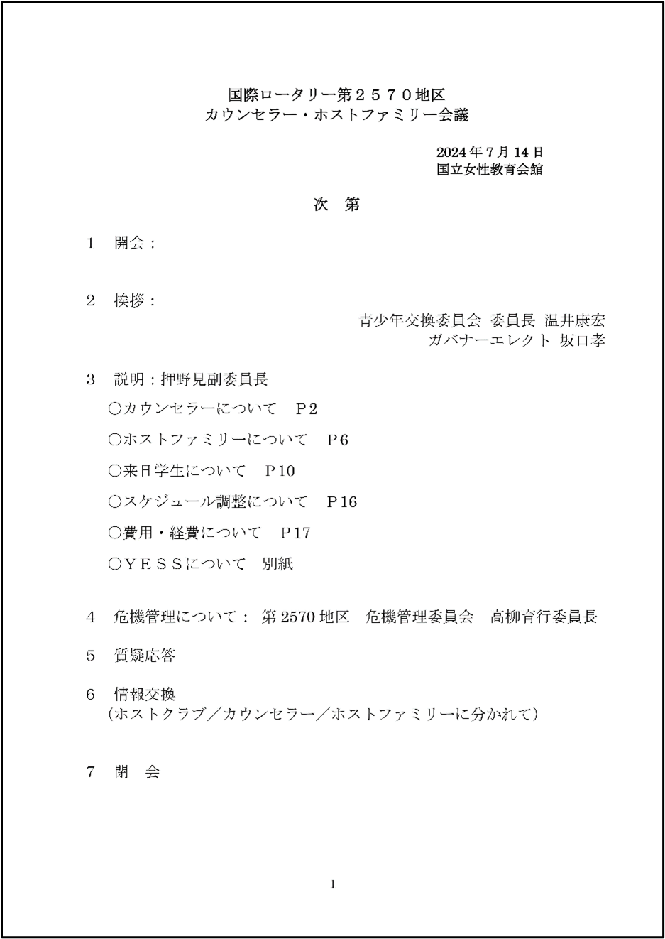 8月には当地区から5名の高校生がフランス・イタリア・チェコスロバキア・台湾・インドネシアの各国へと旅立ち、海外のそれぞれの国から5名の高校生がやってきます。世界中のロータリアンが力を合わせて、「目の前」の、また「全世界の」『青少年たち』に、今までに体験したことのないような体験をさせてあげたいとの熱い思いを形にした、継続しつづけている事業です。どうぞ、今期はスポンサー・ホストではないクラブのロータリアンの皆様も、次年度以降、留学を志望する学生からの依頼があった際には、是非スポンサー・ホストクラブのご検討を頂くとともに、今期の交換学生達・ホストとなる各クラブの皆様に対しましては、あたたかな眼差し、励ましのお声がけ、ご協力を頂けましたら幸いです。何卒よろしくお願いいたします。